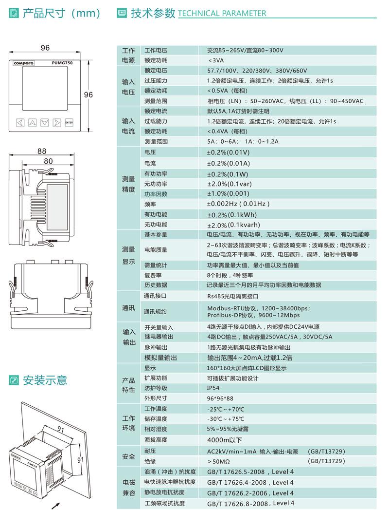 PUMG750是遵循国际电能质量标准而推出的新一代高端电能质量分析仪表,监测所有电能质量参数,如闪变,记录电压短时中断,谐波最高至63次的测量分析。