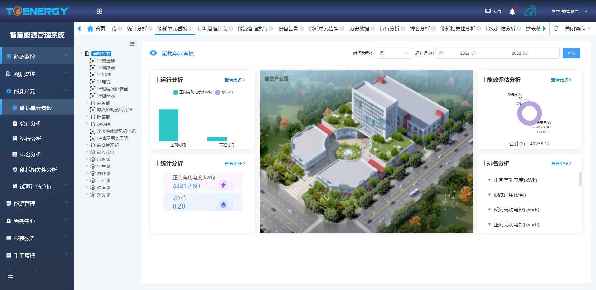 T@Energy智慧能源管理系统对能源使用情况,对设备运行实行集中监测、管理和分散控制。以区域数据为基础,结合“互联网+大数据”的有效利用,自由组合成多个“能耗单元”,通过智慧能源综合管理平台的实现能碳管理、能耗分析、单耗指标、专家评估、智能预测等。主要侧重于对水、电、气、暖的用能分析。大屏展示: