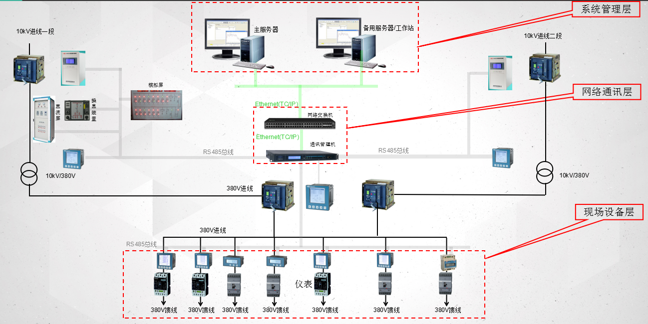 电能管理系统通过遥测和遥信技术有效的对电压、电流、电度、温度、湿度等模拟量的进行监测,对断路器开关位置、电缆带电状态、变压器温度是否超温的报警信号等有关“0”或“1”的信号量的监测。电能管理系统通过记录管理收集到各项数据,为企业调配负荷提供数据支撑,可有效的做出科学的决策。