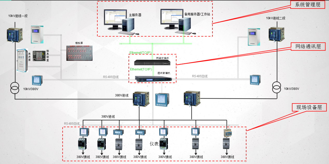 ug环球视讯的电能管理系统主要分为三层分别为:系统管理层、网络通讯层、现场设备层。