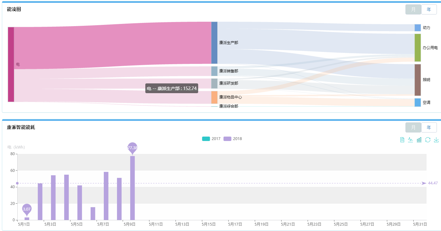 该功能可以实现对企业整体、部门、设备耗能的变化趋势进行统计并与同期的耗能进行分析对比;可对电量指标进行综合分析(电量电费分析、负荷特性分析、电价时段分析、功率因数分析)。通过数据的支撑和对比分析,为企业用能的改善提供科学的数据支撑。