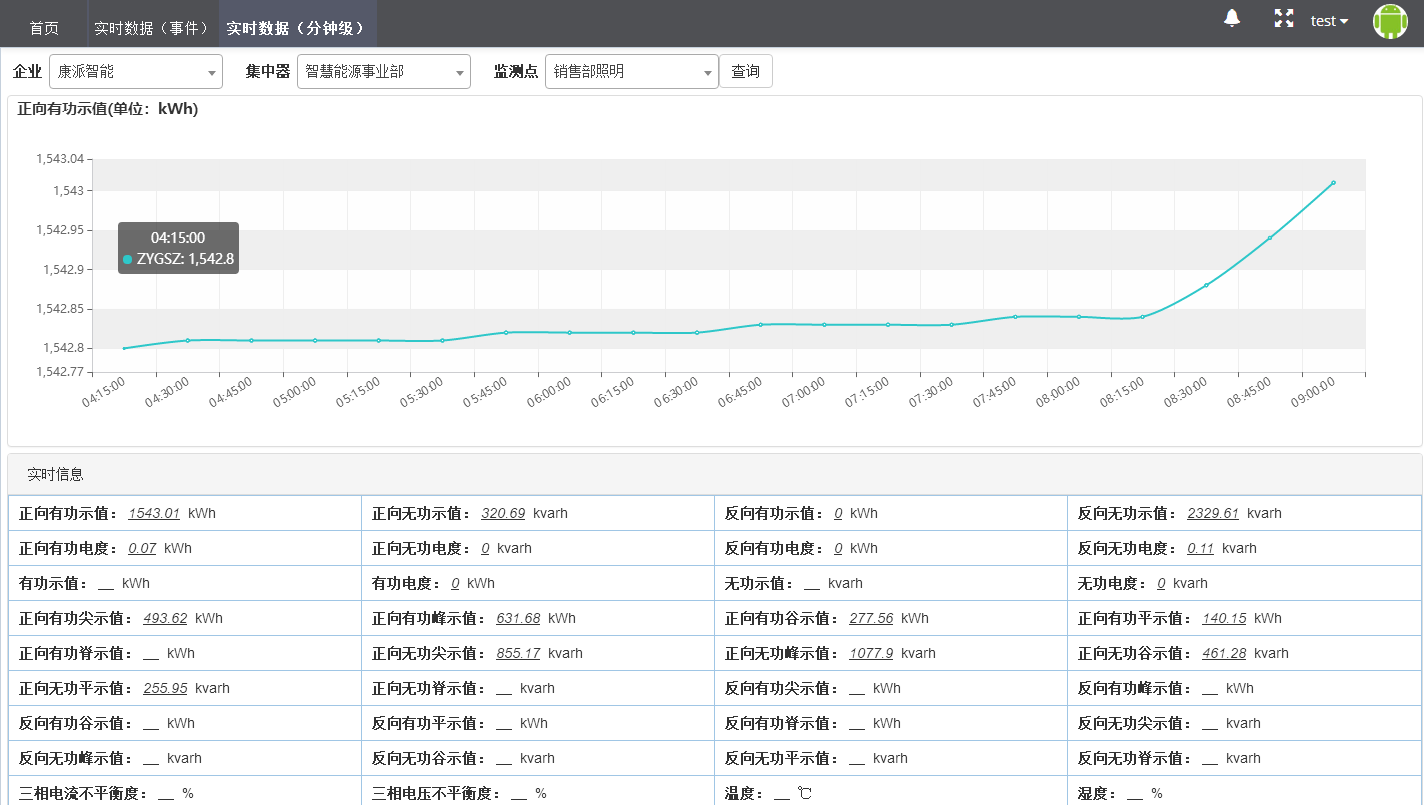 分钟级实时数据主要展示所采集的用电设备四象限电能、复费率电能统计、电流不平衡率、电压不平衡率、温度和湿度等数据,每15分钟刷新一次。选择集中器,选择监测点,点击查询就会调出当前用能设备分钟级实时数据,点击数据变量,就会生成与之相对应的实时曲线,通过曲线查看数据情况,进而了解设备用能及运行情况。