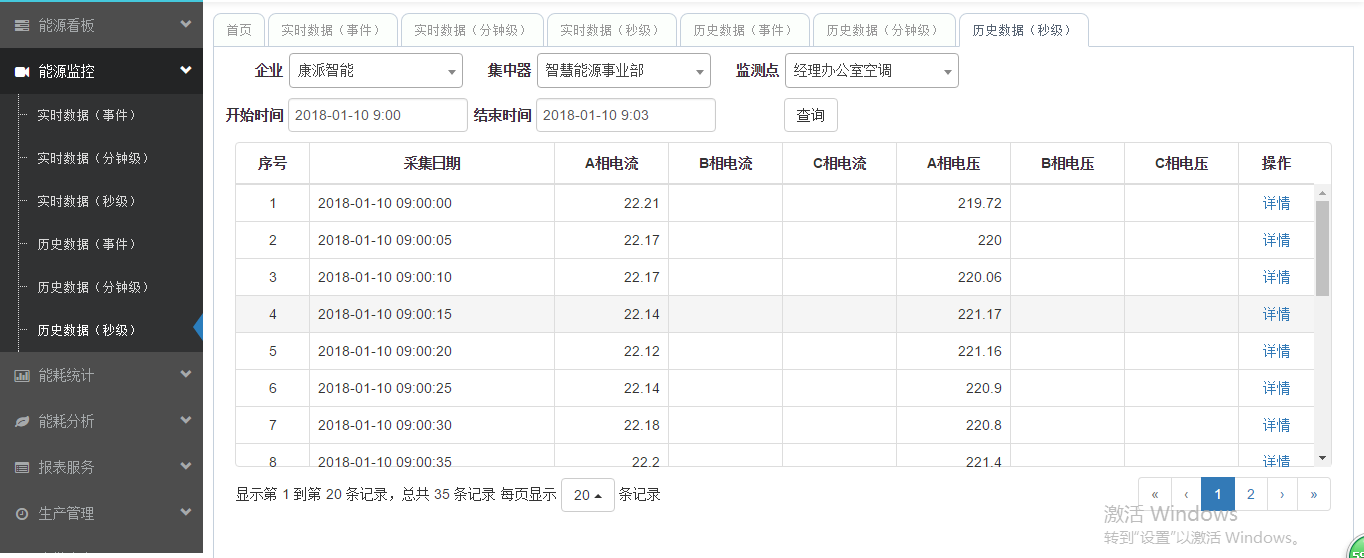 秒级历史数据可以在历史数据(秒级)中查到,选择集中器,选择监测点,选择时间段,点击查询就会调出如下图所示当前用能设备秒级历史数据记录。通过查看不同时间的秒级历史数据,可以了解设备运行情况,当有故障发生,通过查看历史数据,可以初步判断问题所在,缩小排查范围,对设备维护起着重要作用。