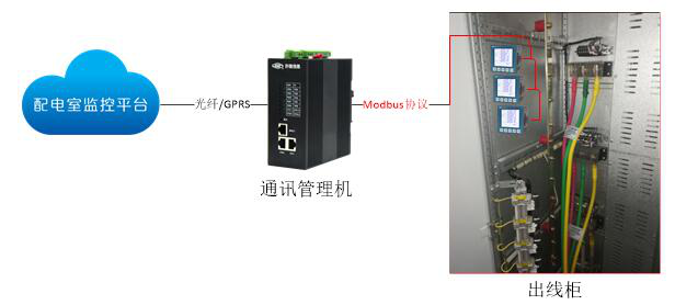 通过变压器温控器采集变压器三相铁芯的温度,及启停变压器的风机,有油位传感的可以检测油位,对于调容调压配电变压器,可以实现调容调压的操作和检测;变压器温控器通过Modbus通讯协议将温度信号传至通讯管理机。