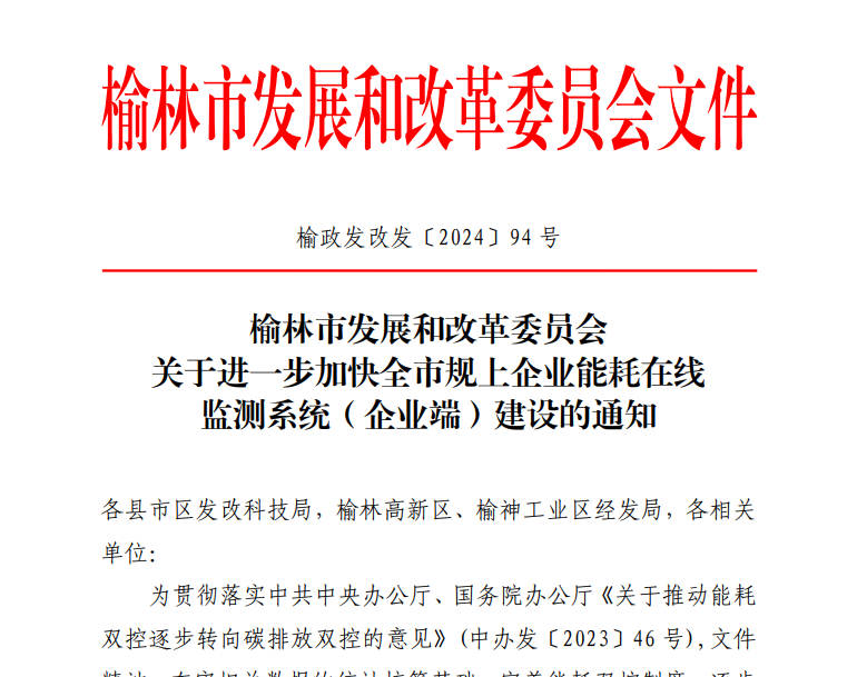 根据榆林市发展和改革委员会下发的文件通知,为加快推进榆林市重点用能单位能耗在线监测系统平台建设,要求榆林市各企业年消耗 1000 吨标准煤以上或消耗电力 500 万千瓦时以上的新建项目,在入统前均要接入市平台,实现一级计量能源消耗和外供数据的实时采集。