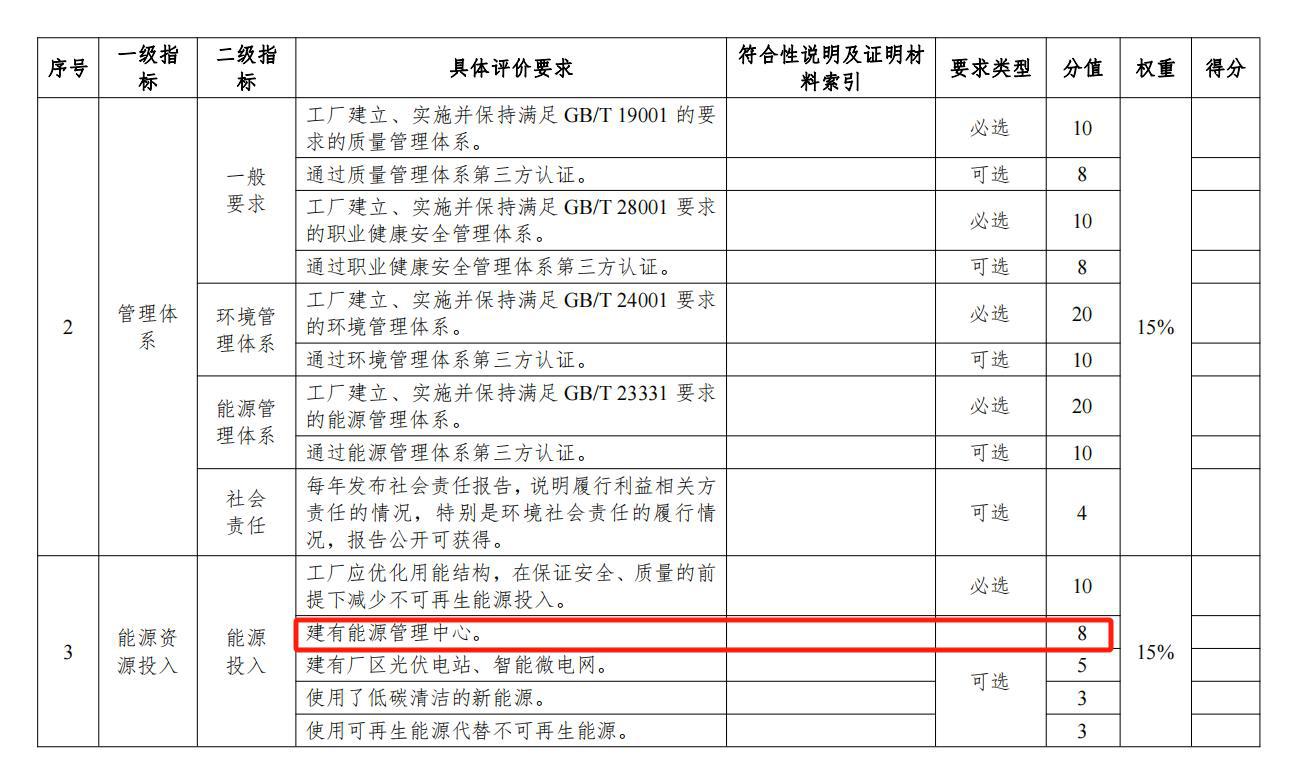 绿色工厂:根据工业和信息化部2024年1月19日关于印发工信部节〔2024〕13号《绿色工厂梯度培育及管理暂行办法》的通知中第五章配套机制中第二十二条、第二十三条、对绿色工厂企业提供规划布局、技术改造、专项资金申请、政府采购、试点示范、金融服务、品牌宣传等方面的支持。同时,附表1.1.2绿色工厂评价指标第三方评价表一级指标中能源资源投入的二级指标能源投入的具体评价要求中建有能源管理中心可以+8分。如下图:
