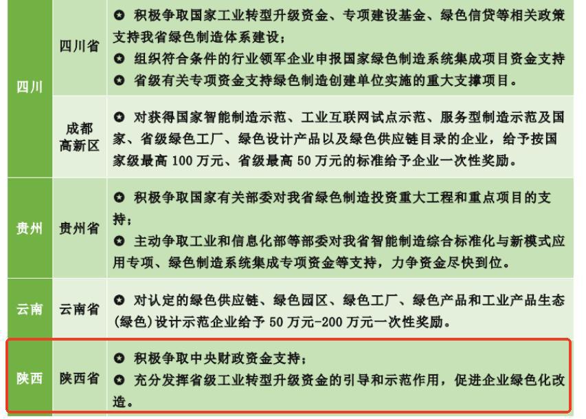 为贯彻落实《“十四五”工业绿色发展规划》《工业领域碳达峰实施方案》,各省份积极响应并分别发布了依据本地区特点制定的相关政策,为激励工业企业积极进行绿色工厂、绿色设计产品、绿色园区创建和申报,大部分地区政府对于入选国家级绿色园区、工厂名单的企业给予一次性奖励100万元,部分城市的奖励金额更是达到了1000万元。关于绿色工厂,不同的省市都有不同的鼓励性政策补贴,下图是山西省份的政策补贴: