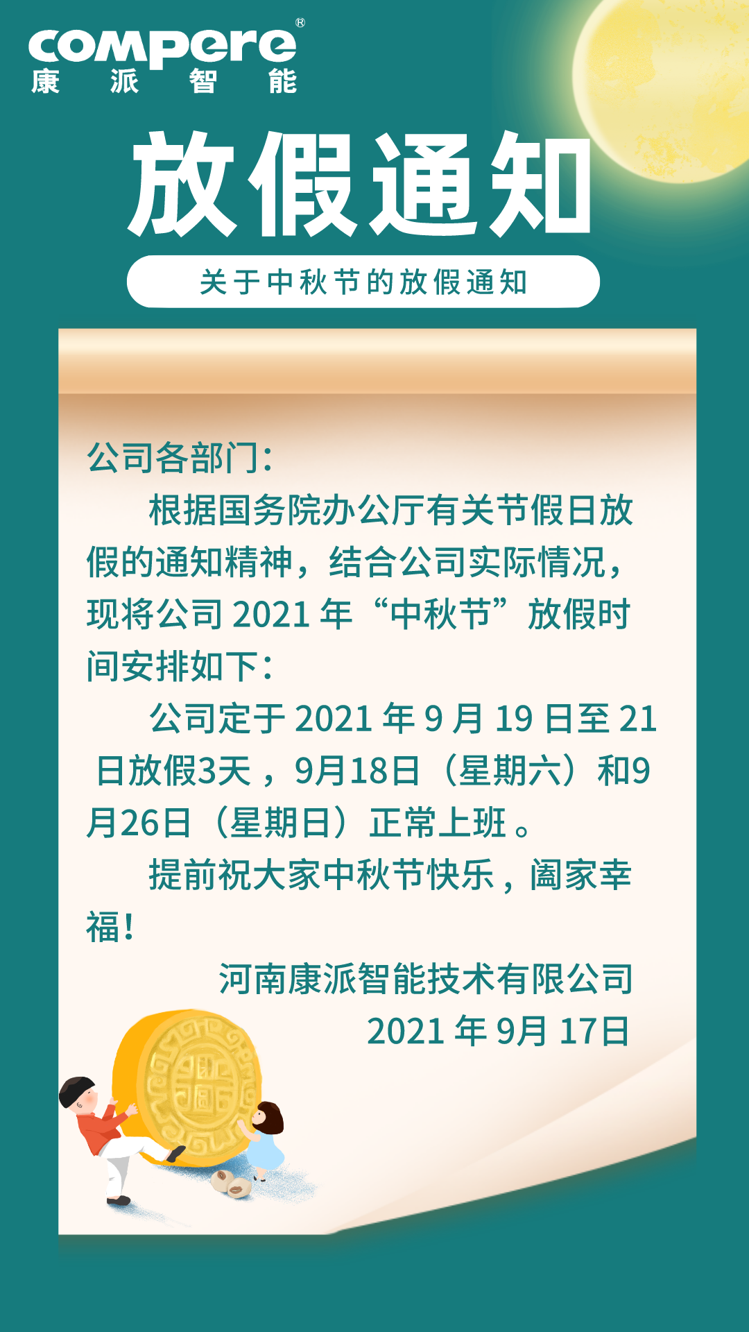 根据国务院办公厅有关节假日放假的通知精神,结合公司实际情况,现将公司 2021 年“中秋节”放假安排如下: