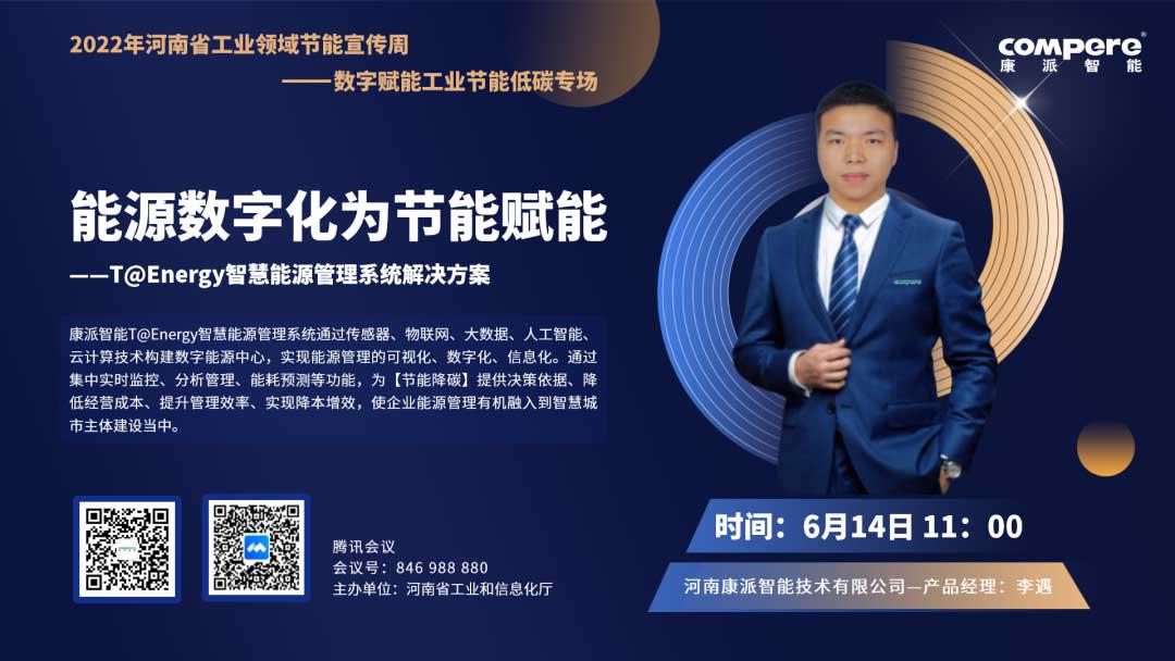 2022年6月,响应国家发改委与河南省工信厅“节能宣传周”活动要求,ug环球视讯积极响应,主动配合完成数字赋能工业节能低碳专场活动,以线上宣传的方式,向社会及工业企业完成主题为《能源数字化为节能赋能--T@Energy智慧能源管理系统解决方案》的宣讲活动。
