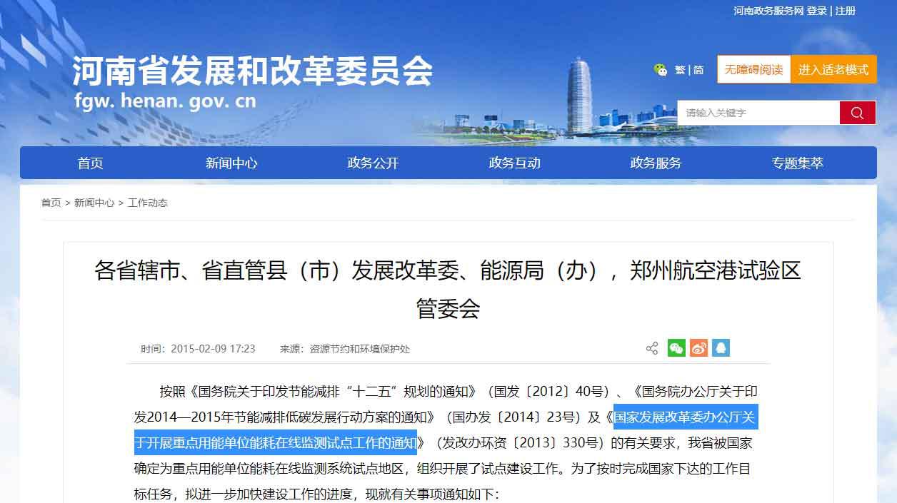 根据国家发展改革委、质检总局联合印发的《重点用能单位能耗在线监测系统推广建设工作方案》及《国家发展改革委办公厅关于开展重点用能单位能耗在线监测试点工作的通知》(发改办环资〔2013〕330号)的有关要求,加快河南省重点用能单位能耗在线监测系统平台建设,推进重点用能单位完善能源计量体系、提升能源管理精细化水平。