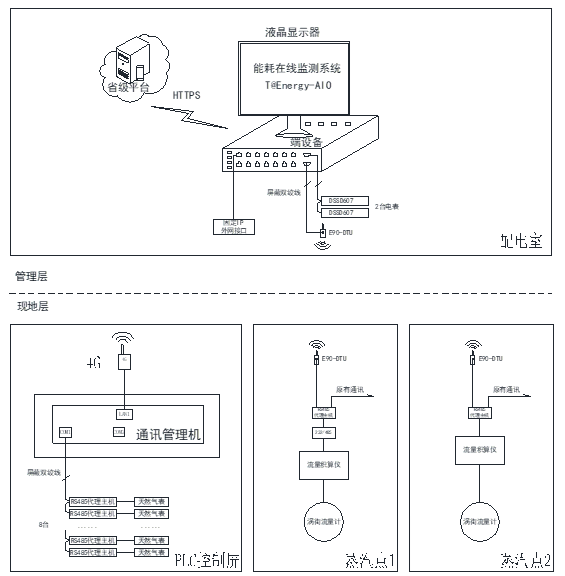 方式二:增加一套蒸汽流量计,该流量计具备通讯功能,单独用于能耗在线监测系统。配套设备有无线Lora,将表计的RS485口接入无线Lora模块, Lora模块将数据传输至端设备。
