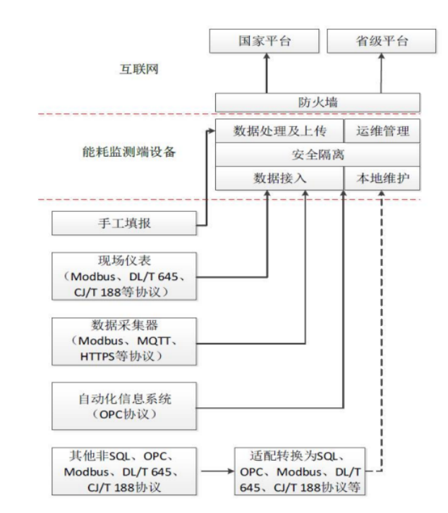 ①支持从现场的仪表获取数据:通过 Modbus(GB/T19582)、 DL/T645、CJ/T188 协议,从现场仪表采集需要的能耗实时数据,并进行汇总生成上报的能耗数据;